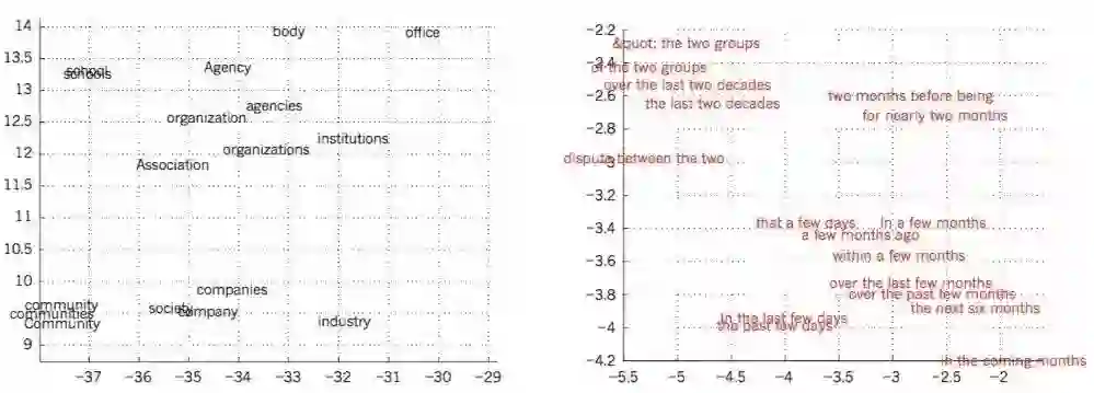 在介绍神经语言模型前,简述下标准方法,其是基于统计的语言模型,该模型没有使用分布式特征表示。而是基于统计简短符号序列出现的频率增长到N(N-grams,N元文法)。可能的N-grams的数字接近于VN,其中V是词汇表的大小,考虑到文本内容包含成千上万个单词,所以需要一个非常大的语料库。N-grams将每个单词看成一个原子单元,因此不能在语义相关的单词序列中一概而论,然而神经网络语言模型可以,是因为他们关联每个词与真是特征值的向量,并且在向量空间中语义相关的词彼此靠近(图4)。
