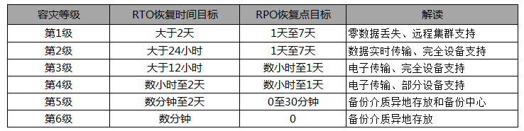 以下是《信息安全技术信息系统灾难恢复规范》对灾备数据中心根据RPO与RTO两项指标分成了6个相应的等级: