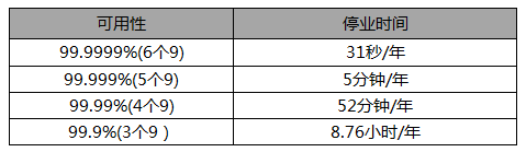 业界通常会用N个9来体现可用性程度,计算方法是:可用性=平均故障间隔时间MTBF/(平均修复时间MTTR +平均故障间隔时间MTBF)