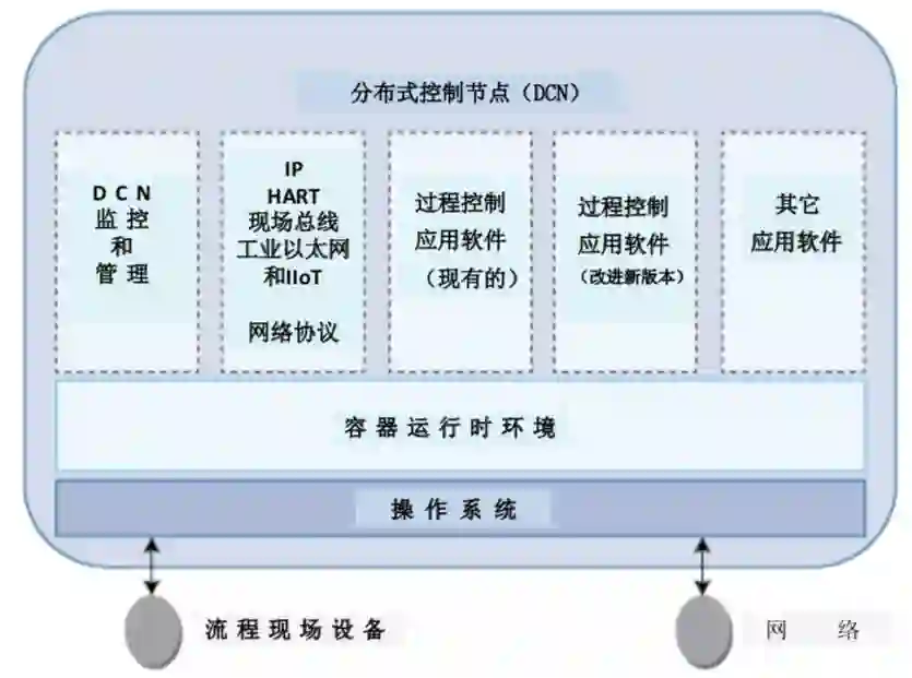 (1)由埃克森美孚倡导的开放式流程自动化OPA,是针对现有的DCS和PLC系统不能适应未来的OT/IT深度融合的要求而提出的标准化活动。活动聚焦于如何运用最新的分布式云计算技术和虚拟化技术,重新定义已经日趋陈旧、20多年没有变动的架构,重新定义DCS和PLC,以及与优化运营密切相关的先进控制和MES。图4表示如何将容器技术运用于OPAF的架构,构成一个分布式控制节点(DCN)。根据实际的需要,可以在一个DCN容器中容纳所需要的各种APP,如监控和管理DCN的APP、现场总线和工业以太网的APP、现有的过程控制算法APP、新开发的过程控制算法APP等等。