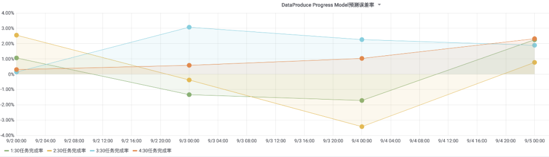 数据系统的状态随时在变化,因此模型的效果也会随之衰退,因此为保证模型的准确率,我们会将每天生产系统的运行数据对我们的沙盘推演模型进行验证和修正。以下是我们的 DataProduce Progress Model 的准确率监控曲线,误差率在 [-4%,4%] 范围波动。