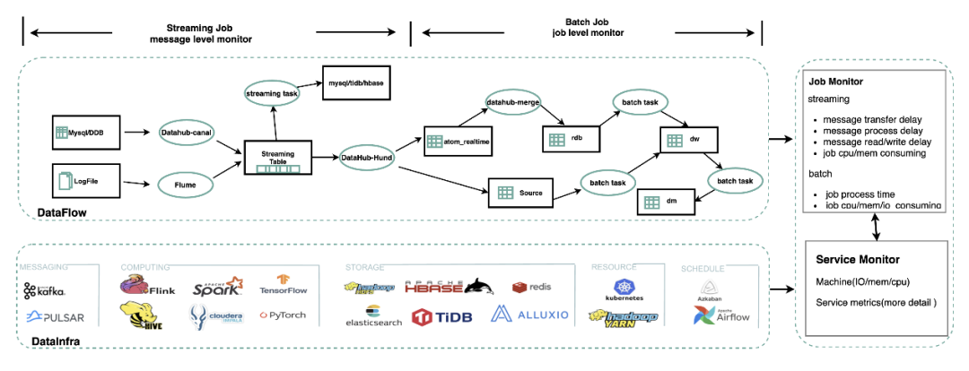批处理阶段需要依赖大量的数据基础设施互相协作,监控服务会监控调度服务 AirFlow,Azkaban,HDFS,spark/hive 等。