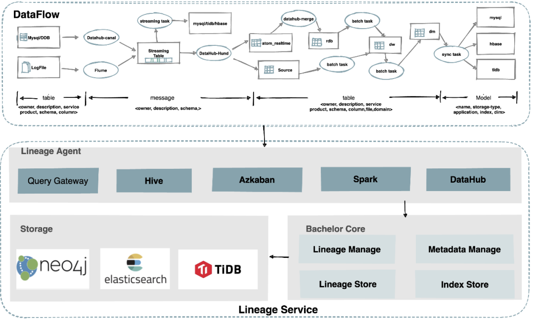 图五是我们血缘服务的架构图,血缘服务主要包括 Lineage Agent 和 Bachelor Core 两个部分。