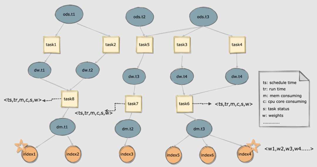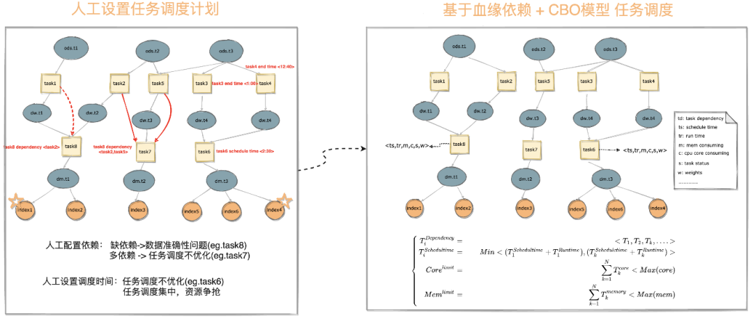 根据系统沙盘模拟我们发现目前调度计划不合理是目前数据生产最大的瓶颈。这个问题本质上,是因为数仓任务的调度时间是通过人工设定的(比如某个任务安排再 01:30AM 执行),随着业务和数据的变化,依赖数据开发同学人工去管理和优化这个调度时间,在具体的管理实践中是一个不可能的目标,系统腐化是不可避免的。
