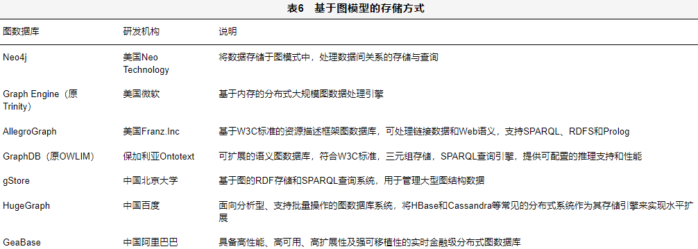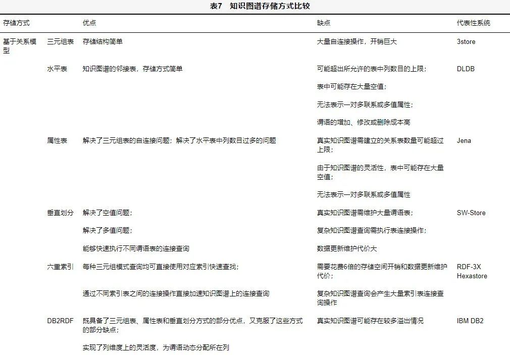 知识图谱的存储方式应考虑其后续的使用效率,应根据自己的应用场景、数据情况来具体设计。可参考表7选择最适用的存储方式。