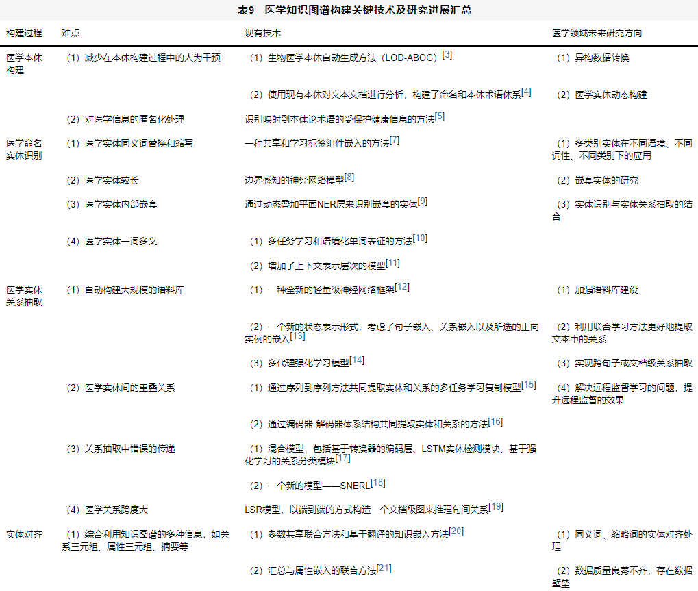 构建医疗领域的知识图谱,可以从海量数据中提炼出医疗知识,并合理高效地对其进行管理、共享及应用,这对当今的医疗行业具有重要意义,也是很多企业和研究机构的研究热点。本文对医学知识图谱构建过程中的研究热点、现有技术、挑战及未来发展方向进行了综述,具体见表9。医学知识图谱将知识图谱与医学知识结合,定会推进医学数据的自动化与智能化处理,为医疗行业带来新的发展契机。医学知识图谱未来总的发展方向应该体现以下几个方面。