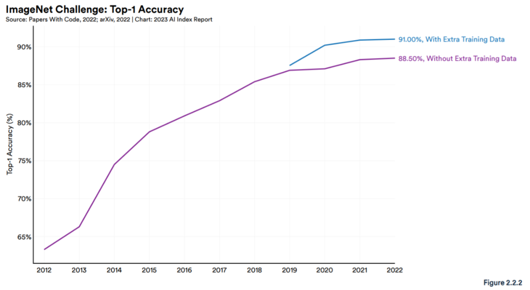 图像分类:截至 2022 年,ImageNet 数据集上的 top-1 准确率已经达到 91.0%: