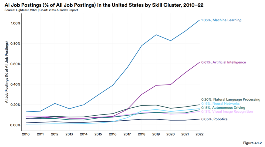 图 4.1.2 展示了自 2010 年以来美国劳动力市场最受欢迎的 AI 技能集群。最受欢迎的技能集群是机器学习 (1.0%),其次是人工智能 (0.6%) 和自然语言处理 (0.2%)。