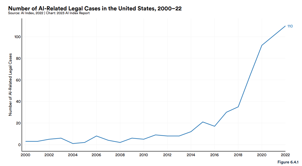 法律界审理了更多人工智能相关案件。2022 年,美国各州和联邦法院审理了 110 起与人工智能相关的法律案件,大约是 2016 年的 7 倍。