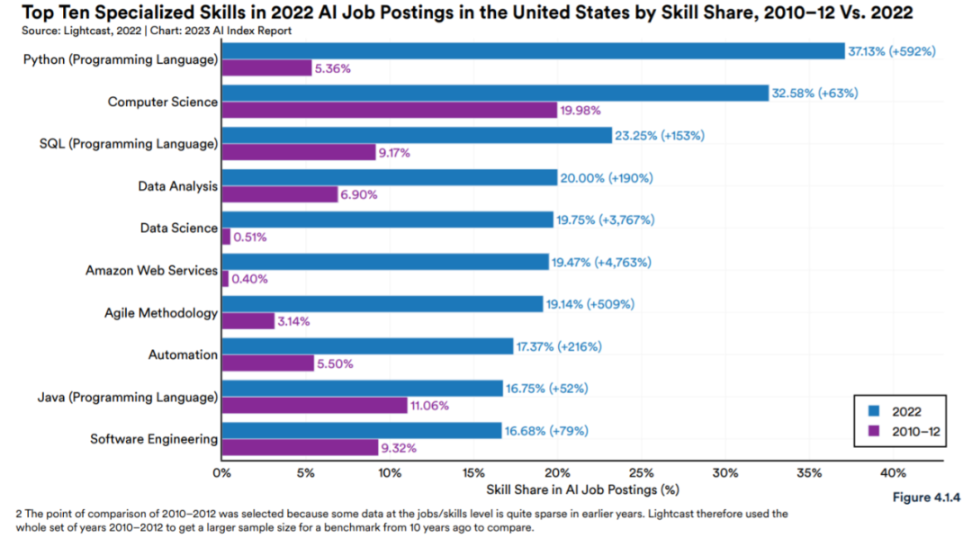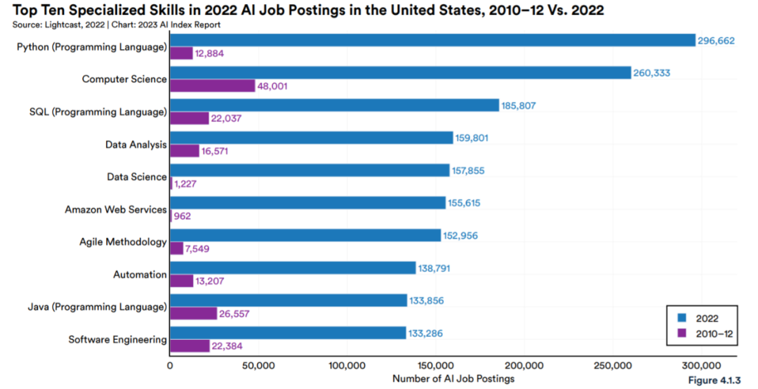 图 4.1.3 和 4.1.4 展示了与 2010-20122 年相比,2022 年 AI 职位发布所需的十大专业技能。就绝对水平而言,与十年前相比,现在对几乎所有专业技能的需求都更大。对 Python 的需求增长尤为显着,这证明它作为一种 AI 编码语言越来越受欢迎。