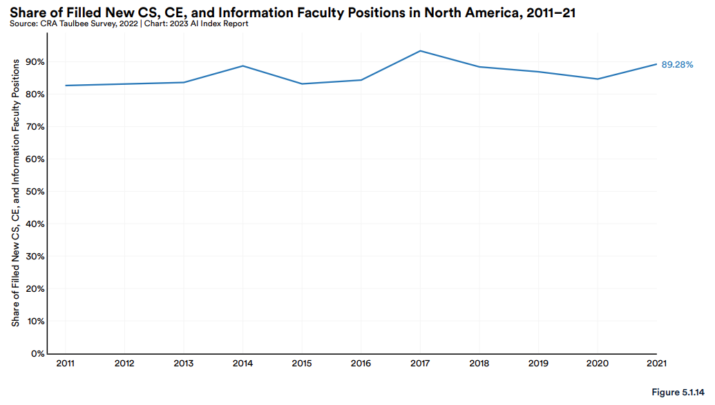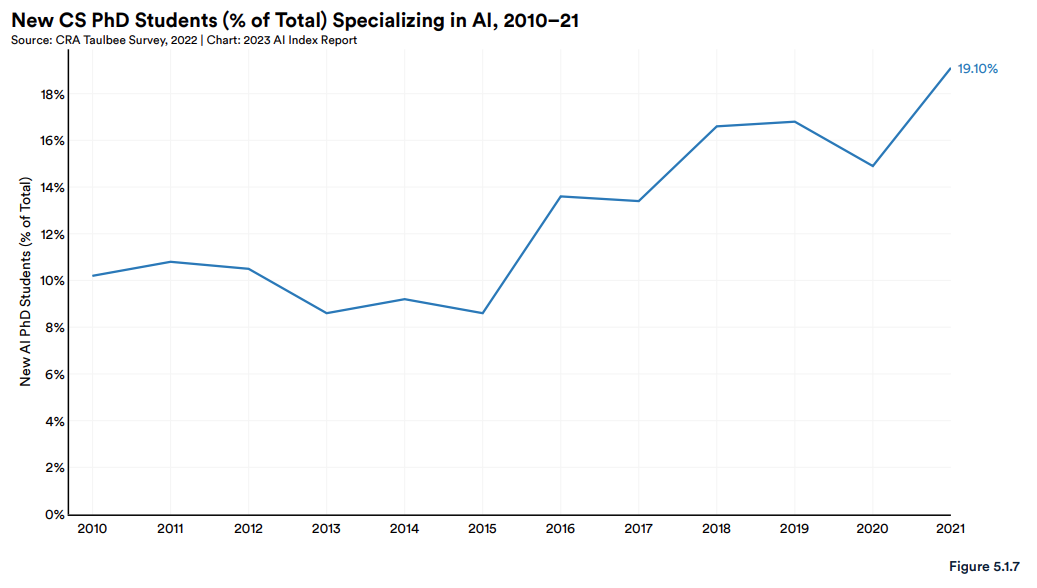 人工智能专业越来越多。美国大学计算机科学类博士毕业生中 AI 专业的比例从 2010 年的 10.2% 到 2020 年的 14.9% 跃升至 2021 年的 19.1%。