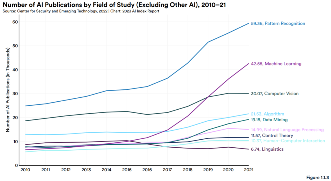 按照专业方向来分,图 1.1.3 表明模式识别和机器学习方面的出版物在过去五年中增长最快。自 2015 年以来,模式识别方面的论文数量大约翻了一番,而机器学习论文的数量大约翻了两番。