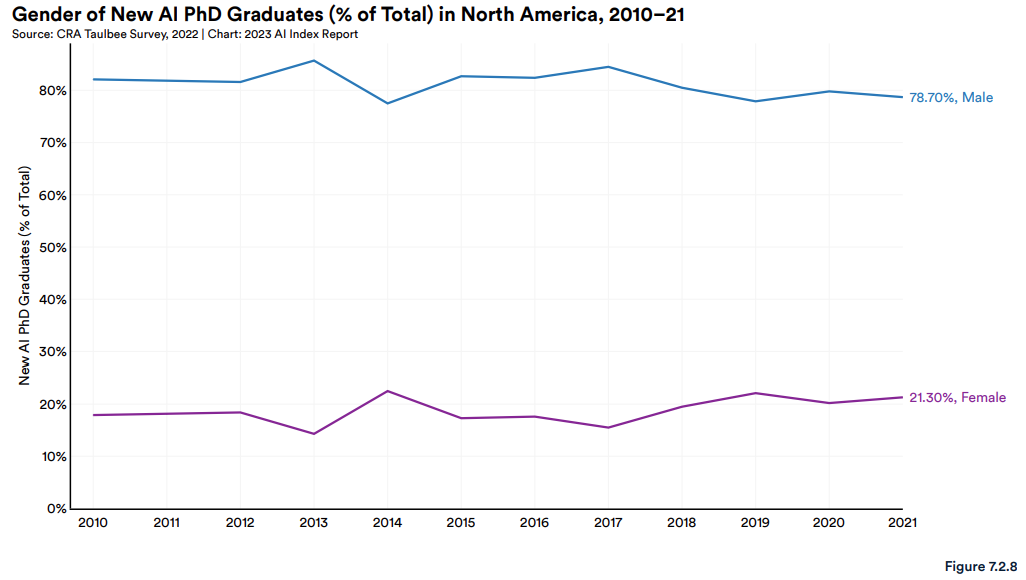 在性别比例方面,AI 博士仍然绝大多数是男性。2021 年,78.7% 的 AI 博士毕业生是男性。只有 21.3% 是女性,比 2011 年增加了 3.2 个百分点。人工智能高等教育仍然存在性别失衡。