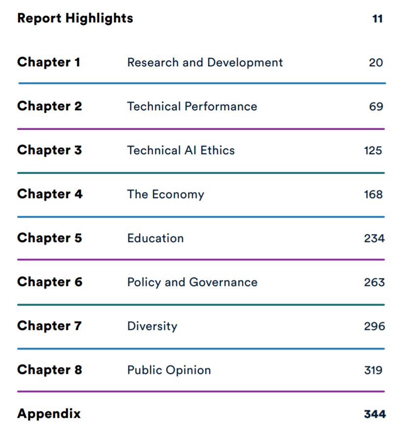 该报告从八个方面展开:研究与开发、技术性能、AI技术伦理、经济、教育、政策和治理、多样性以及舆论。
