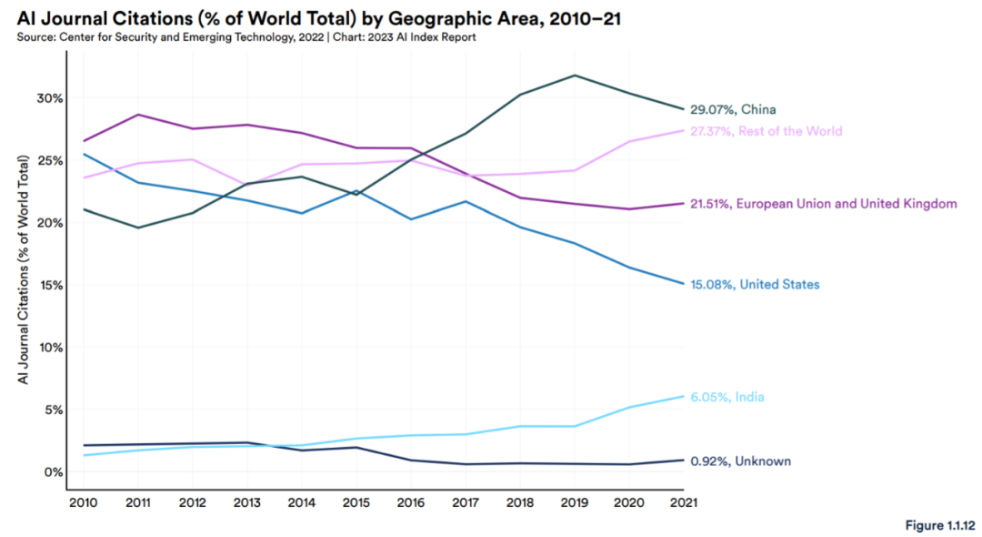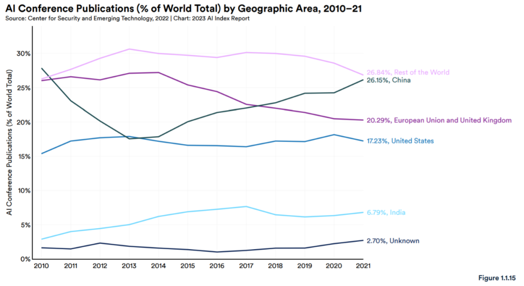AI 期刊论文的发表数量,中国始终保持领先地位,2021 年为 39.8%,其次是欧盟和英国(15.1%),然后是美国(10.0%)。