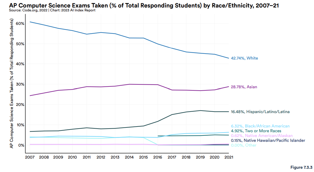 值得一提的是,美国 K-12 计算机科学教育在性别和种族方面变得更加多样化。女性学生参加 AP 计算机科学考试的比例从 2007 年的 16.8% 增加到 2021 年的 30.6%。