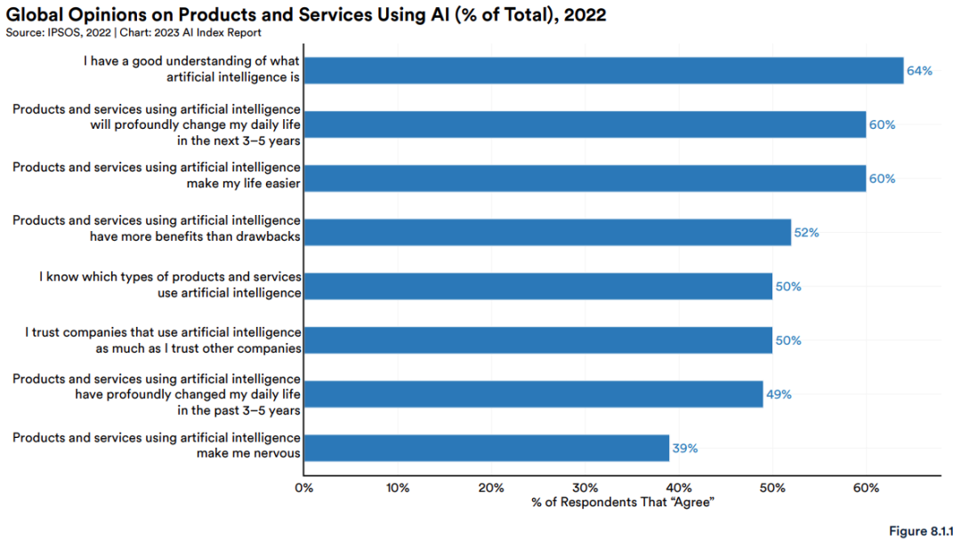 AI Index 借用 2022 IPSOS 的调查数据,分析了人们对人工智能产品和服务的看法。