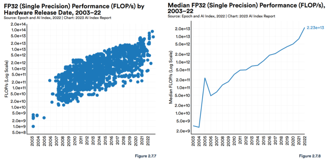 图 2.7.7 展示了从 2003 年到 2022 年发布的不同 GPU 的 FP32 性能。FLOP/s 越高,硬件越好。图 2.7.8 显示了按发布日期划分的新 GPU 单项性能中值,该值逐年上升。