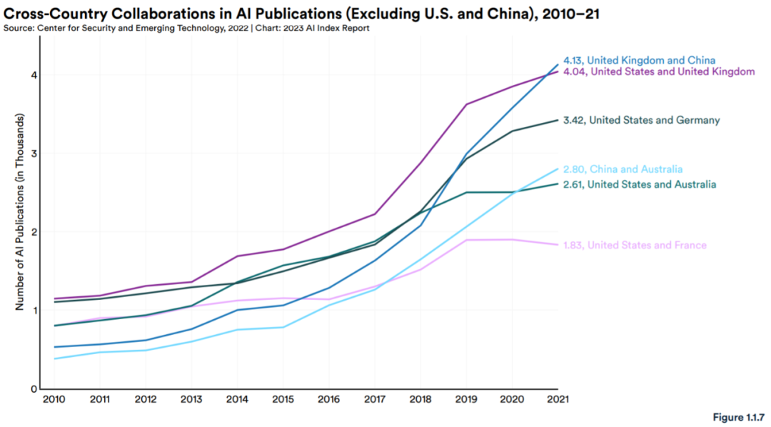 跨国合作:图 1.1.6 和 1.1.7 描述了 2010 年至 2021 年最大规模的跨国 AI 合作。结果表明,过去 12 年中中美合作次数最多,自 2010 年以来增长了大约四倍。然而,从 2020 年到 2021 年,中美合作总数仅增长了 2.1%。2021 年,美国和中国之间的合作数量是英国和中国的 2.5 倍。