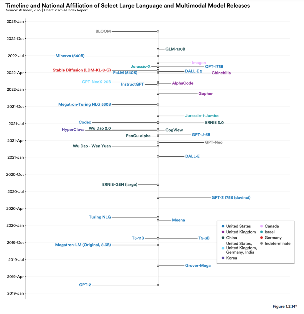 图 1.2.14 提供了自 GPT-2 以来发布的大型语言模型和多模态模型的时间线视图,以及发布这些模型的研究人员的国家隶属关系。