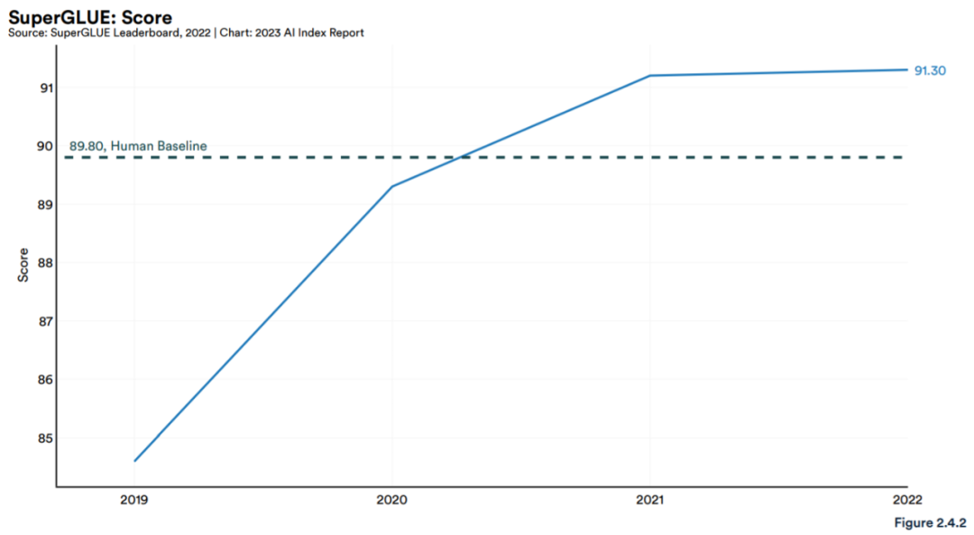 此外,达到基准饱和的速度正在增加。然而,新的、更全面的基准测试套件,如 BIG-bench 和 HELM 正在发布。