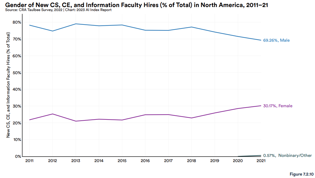女性在 CS、CE 和信息系教职员工中所占比例越来越大。自 2017 年以来,新招聘的 CS、CE 和信息系女教师的比例从 24.9% 增加到 30.2%。尽管如此,北美大学中的大多数 CS、CE 和信息系教师都是男性 (75.9%)。