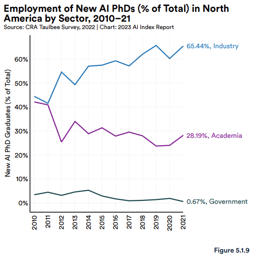 AI 博士毕业生越来越多地前往业界工作。2011 年,AI 博士毕业生在学界 (41.6%) 与业界 (40.9%) 的就业比例大致相同。之后,大多数 AI 博士毕业生都进入业界工作。2021 年,65.4% 的 AI 博士在业界就业,是在学界就业的 28.2% 的两倍还多。