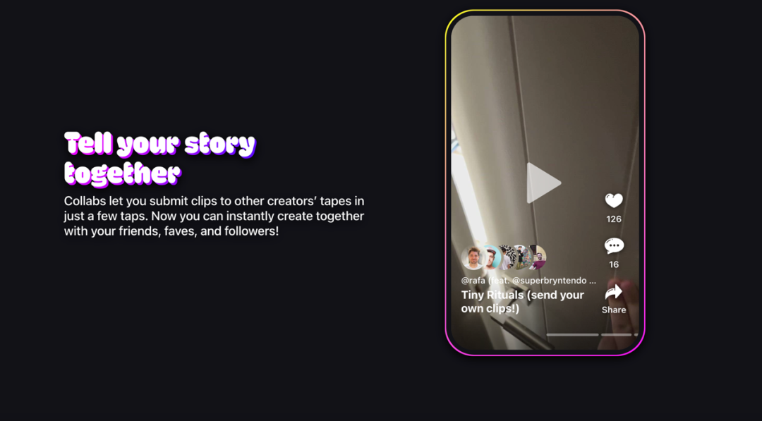 另外,用户还需要设定 Tape 的公开程度以及可合拍范围,一旦用户选择 Tape 对所有用户可见、所有用户可参与合拍,便意味着用户的 Tape 将免费授权给所有用户,每位用户都可以接着用户拍摄的短视频内容进行创作,官方将围绕 Tape 进行创作的模式称之为“Collab”。这种模式对于话题讨论和内容传播都有明显益处。