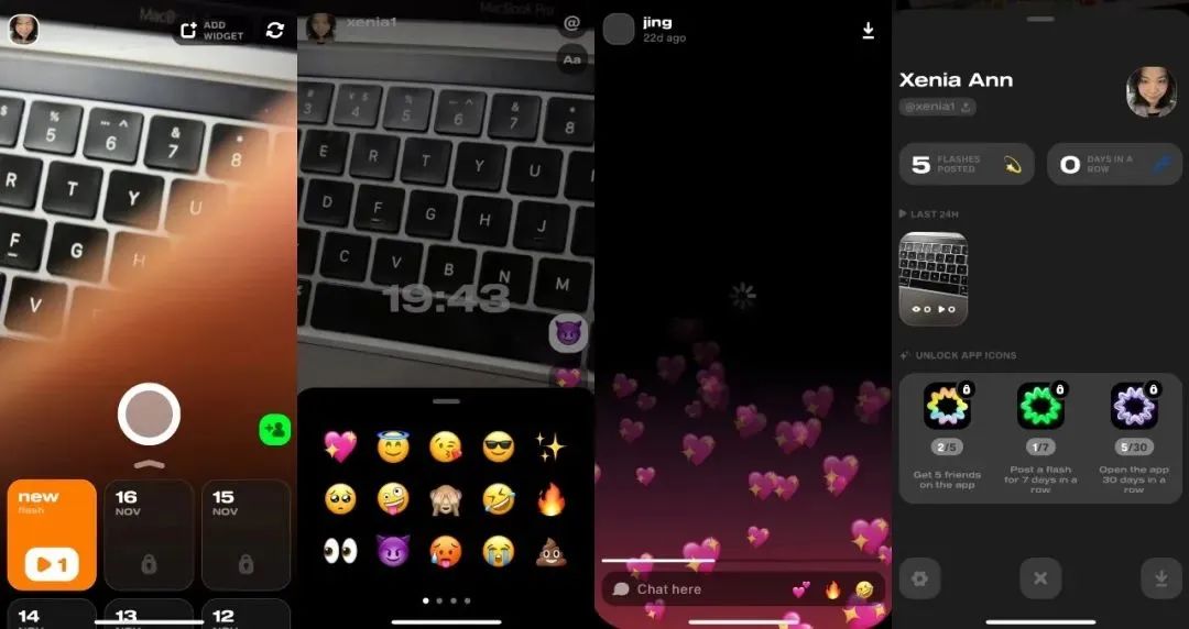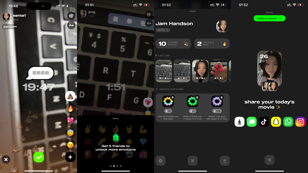 目前「Flashtape」为用户提供爱心、亲亲、火、酷、捂脸等 15 个无限制使用的 Emoji,而用户要想解锁余下 45 个特效需要只要拥有 5 个好友。这也是「Flashtape」增长以及鼓励用户与熟人社交的方式之一。
