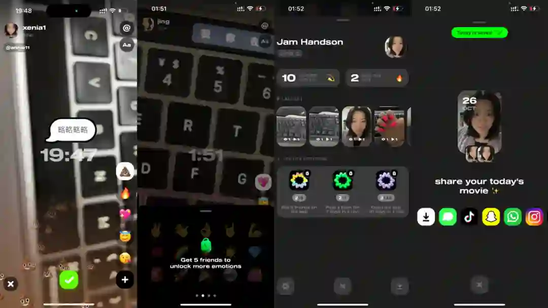 不过「Flashtape」的拍摄和上传过程要更复杂一些,用户在拍摄前可以自由选择前后摄像头,在视频拍摄完成后用户可以添加文字、@用户以及添加 Emoji 特效。