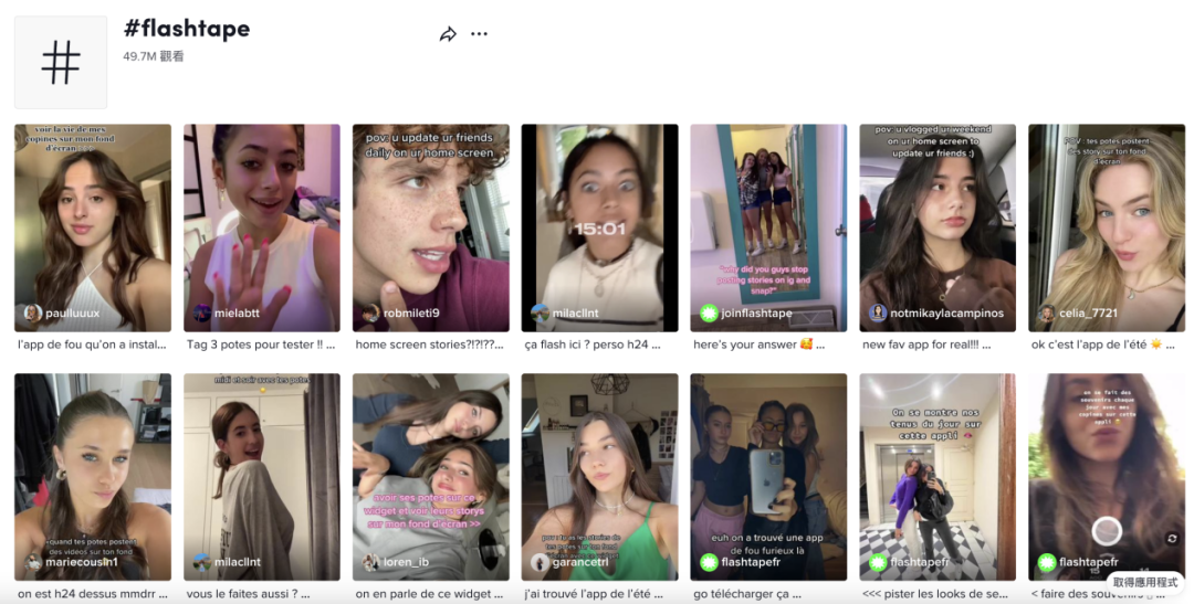 #「Flashtape」相关话题视频在 TikTok 上的播放量已经超过了 4970 万次,不少法国 TikToker 都在 TikTok 上分享自己瞬间合集 Vlog。
