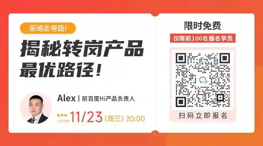 11月23日(周三)晚上8点!前百度Hi产品负责人@Alex老师在线直播,讲述从程序员到大厂产品经理的亲身经历,1小时教你如何斩获高薪产品offer!