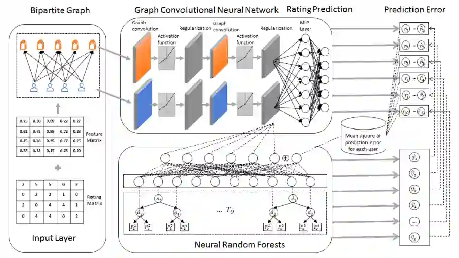 该文提出了一种端到端的统一的学习框架来执行鲁棒的推荐(Robust Recommendation)和欺诈检测(Fraudster Detection)两种任务。在其端到端学习的过程中,基于GCN搭建的推荐组件输出的预测误差可以作为欺诈者检测组件中的重要特征;同时,在欺诈者检测组件中将用户识别为欺诈者的概率可以自动确定该用户的评分数据在推荐组件中的贡献;因此,这两个组件可以相互增强。通过进行广泛的实验,结果表明了该算法在两项任务中的优势-鲁棒的的评分预测和欺诈者检测。