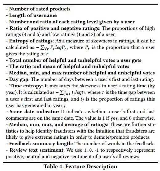 其中值得注意的是,对于图卷积网络(GCN)中的用户结点的属性信息是作者手工构造的,比如评分数目、名字长度、时间差等能反映用户是否异常的属性,具体特征详见下图。