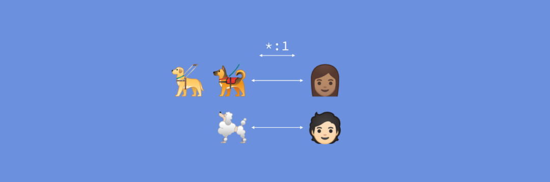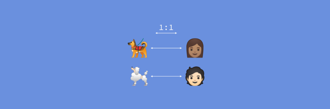 假设我们生活在一个每个人只能拥有一只狗,且每只狗只能有一个主人的 “悲惨世界” 中,这就是一对一关系。如果要以关系型数据库的方式来反应它的话,我们可以创建两张表: