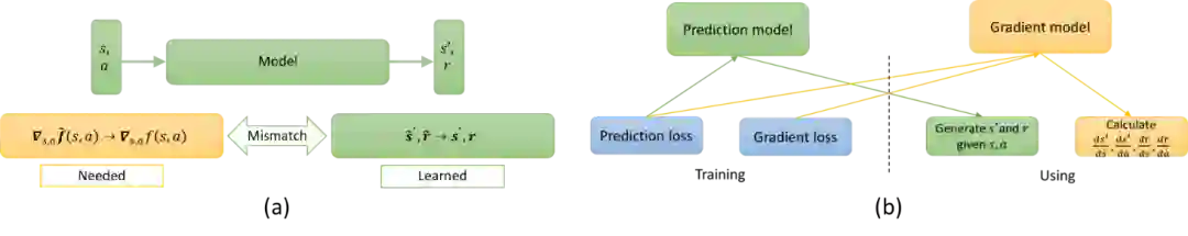 图2: (a)模型学习和使用中的不一致。 (b)DDPPO 算法的示意图。DDPPO 算法分别构造了预测模型和梯度模型。DDPPO 算法使用不同的损失函数去分别训练这两个模型,并且在策略优化中分别恰当地使用他们。