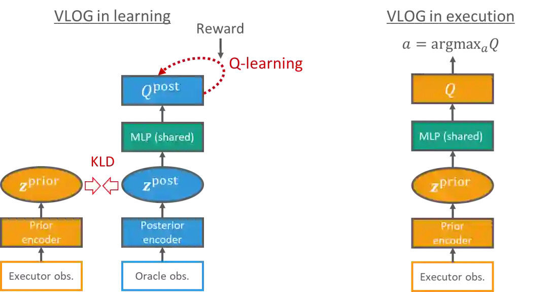 图6:VLOG 在训练时和使用时的模型图表(以 Q-learning 为例)。左:训练时(知道 oracle observation),分别用 executor observation 和 oracle observation 来估计一个贝叶斯隐变量z的先验(prior)和后验(posterior)分布。通过优化 VLOG 变分下界(variational lower bound,后验模型的强化学习目标函数减去z的后验和先验分布之间的KL散度)来训练整个模型。右:使用时,基于可见信息来做出决策。