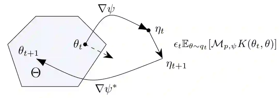 具体来说,SVGD 的原理是使用能最大化样本分布与目标分布之间 KL 散度减小率的更新方向来更新样本,从而使样本分布不断逼近目标分布,而这个减小率和更新方向都是由斯坦因算符给出的。因而论文首先推导出了镜像空间中的斯坦因算符(图中 M_(p,ψ))和样本的更新方向(图中 E_(θ∼q_t ) [M_(p,ψ) K(θ_t,θ)])。