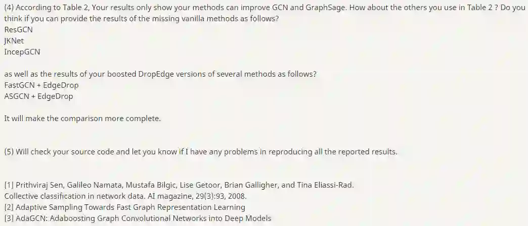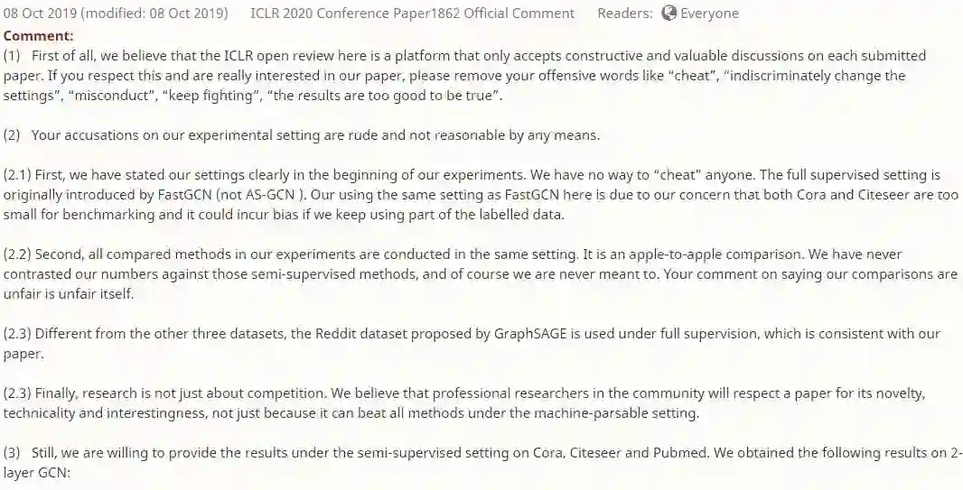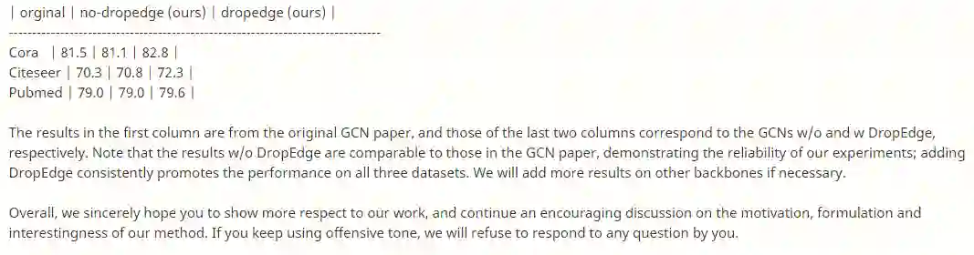 一篇关于GNN方向的提交论文DropEdge: Towards Deep Graph Convolutional Networks on Node Classification,其方法由于结果表现太好被广大网友质疑。一名叫 Alex Williams 的小哥 “放出狠话”,公开叫板,直怼作者团队。认为作者的方法带来的基本上都是伪提升,是改变了数据训练比例的“作弊”手段,对其他科研工作者不公平。作者团队也正面刚回去,并提供了源代码, Alex Williams 小哥继续说他要复现作者论文的结果,看看到底是否有问题。
