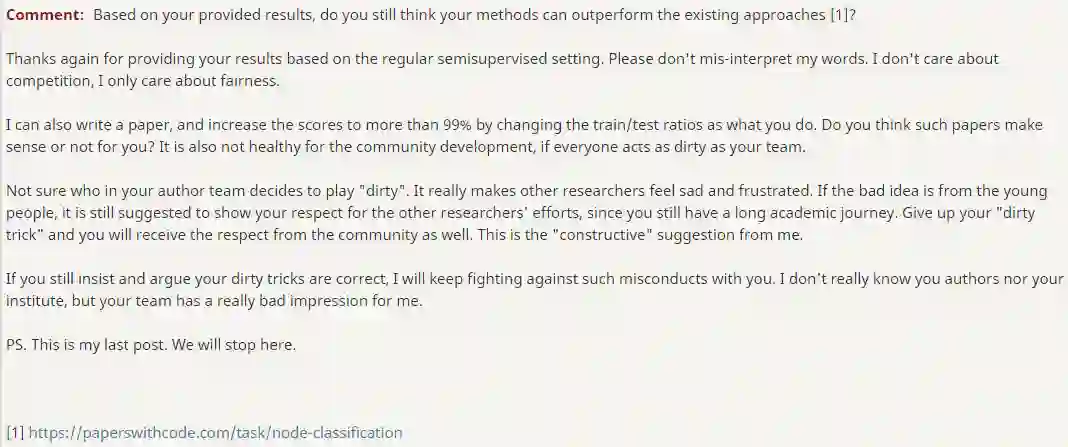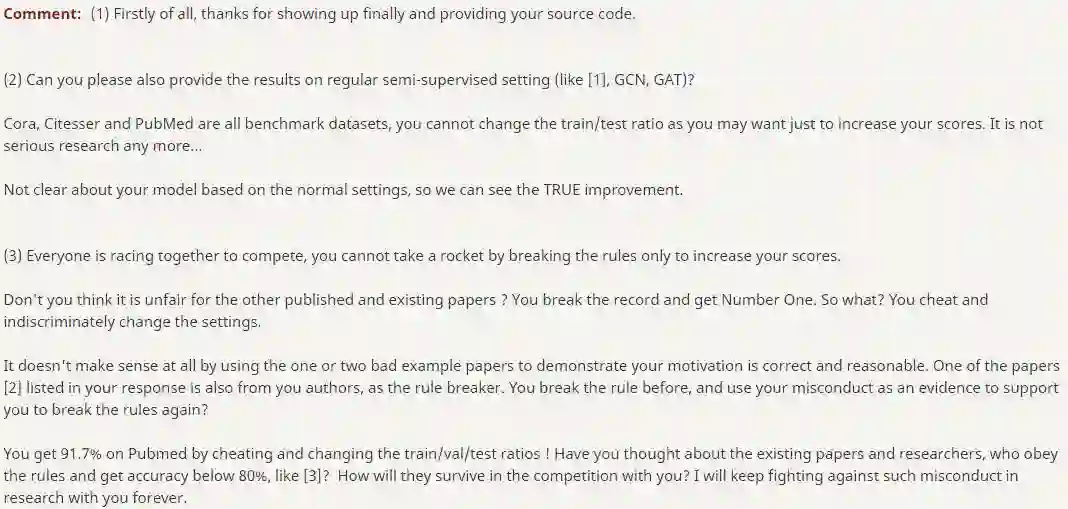 通过作弊和更改train/val/test比率,你们在Pubmed上获得了91.7%的分数! 你们有没有想过现有的论文和研究人员,他们遵守规则,正确率低于80%(就像[3])?,他们将如何在与你们的竞争中生存? 我将永远和他们一起与你们这种研究中的不端行为作斗争。