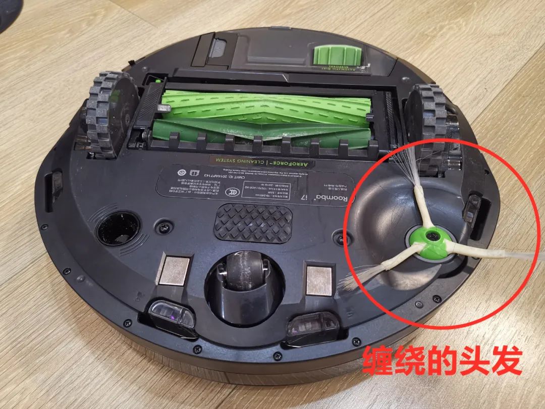 irobot的双胶头滚刷虽然也不会缠绕头发,但是它的边刷却会缠绕上很多的毛发。