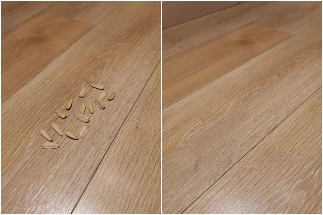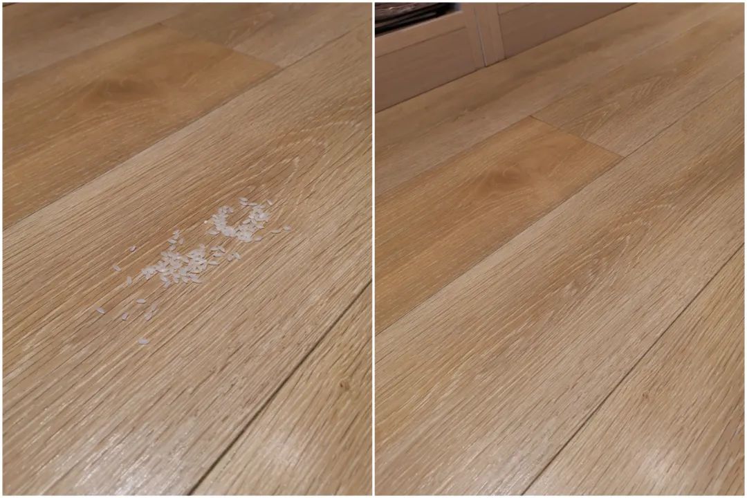 可以看到清理前后的对比图,鲨客清理后的地面完全没有大米的残留。