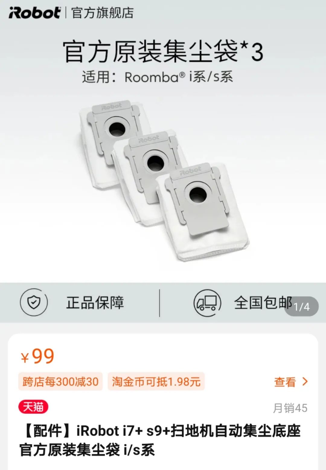 而irobot使用的是集尘袋,需要一个月更换一次,目前99元三个集尘袋,一年下来的耗材费用大概400元。