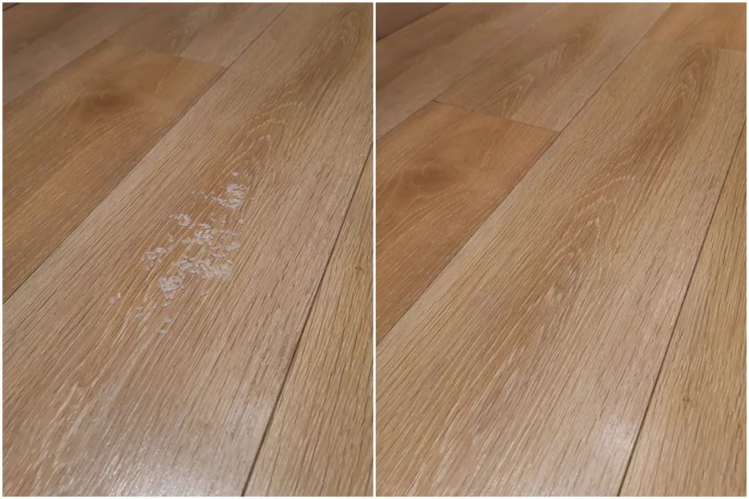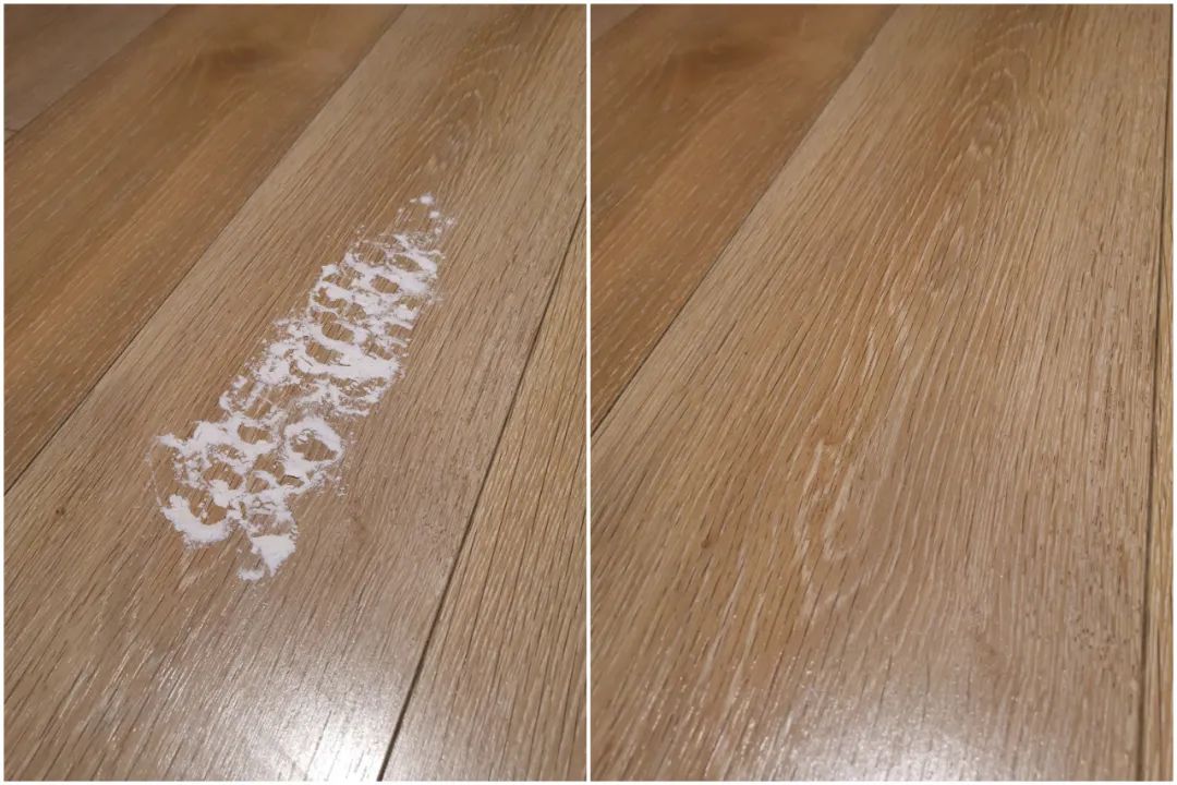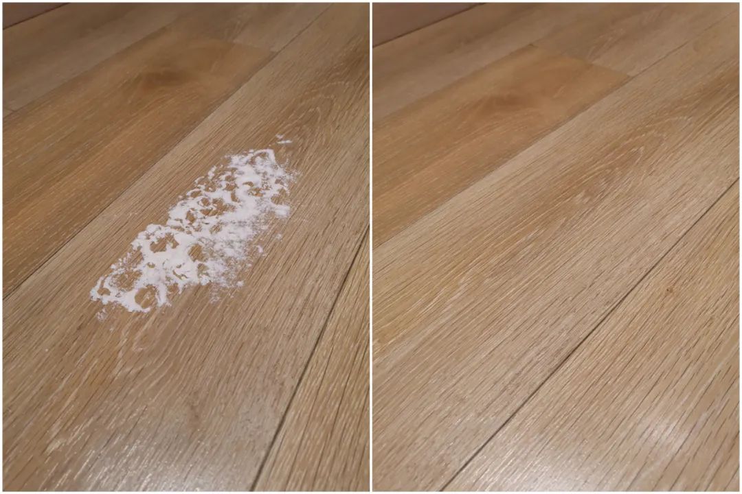 鲨客清理前后对比图,可以看到木地板上的面粉被清理的十分彻底。