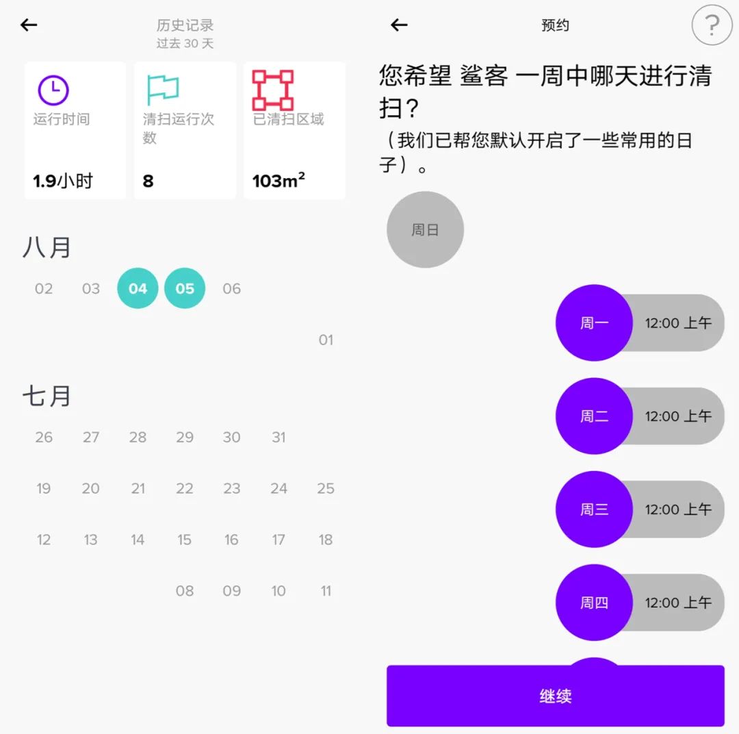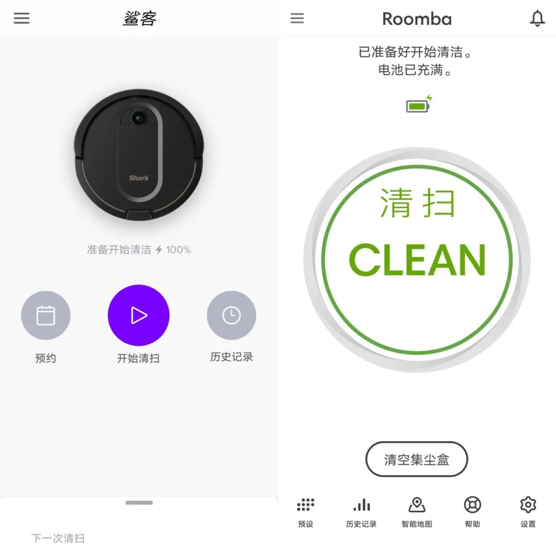 左边是鲨客的APP首页,右边是irobot的APP首页,可以看到两款机器的APP基本就预设、清扫和看历史记录这三个功能,基本上可以满足日常的需求。