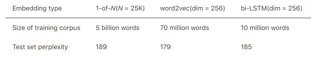 因此,我们决定在用于训练QuickType神经语言模型的(句子)语料库的子集上训练embedding。然后,我们根据我们的标准语言建模测试集上的perplexity来衡量embedding的质量,如表1所示。符号“1-of-N”表示稀疏embedding,而“word 2vec”指的是在大量数据上训练的Word2vec embedding。