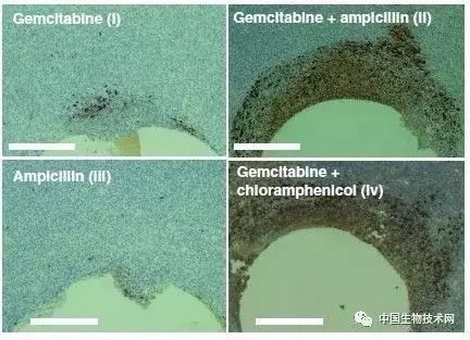总之,这表明癌细胞并没有使用化学防御方法。通过进一步的研究,研究团队发现,培养物中的某些细胞被猪鼻支原体所污染,而这种细菌可以将吉西他滨代谢为对癌细胞无害的物质。为了测试猪鼻支原体是否真的引起了细胞的抗药性,他们将可被治疗的癌细胞植入小鼠体内。某些癌细胞被细菌污染,而另一些则没有。治疗结果表明,被细菌污染的肿瘤对吉西他滨产生了抗性。