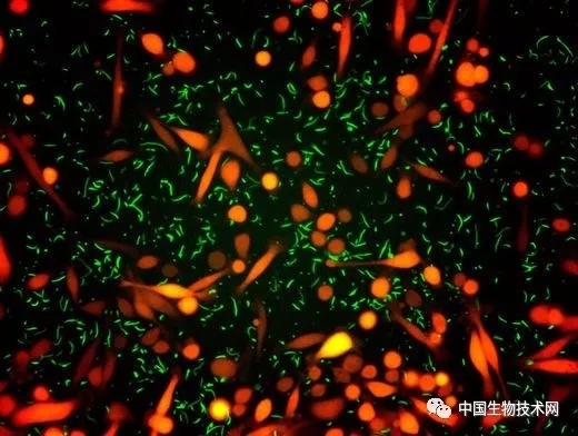 与癌细胞(橘红色)共同生长的细菌(绿色)