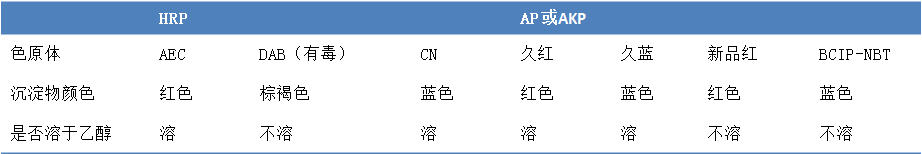 显色常用的酶为辣根过氧化物酶(HRP),常用的显色底物为DAB(3,3’-二氨基联苯胺),偶尔用AEC(3-氨基-9-乙基咔唑)。碱性磷酸酶(AP或AKP)也是目前免疫诊断试剂最常用的标记酶之一,稳定性好、灵敏度高。