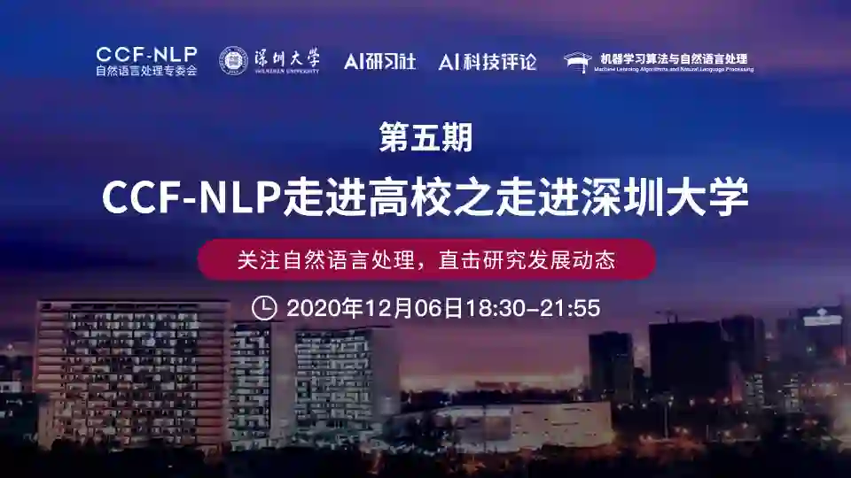 “CCF-NLP走进高校”系列高校NLP研究分享报告会第五期,我们将走进岭南热土,来到极具改革和创新精神的深圳大学,为这里的同学以及线上直播间的观众们分享NLP领域的最新发展成果和未来的研究方向,12月6日(本周日)18:30-21:55,敬请期待!